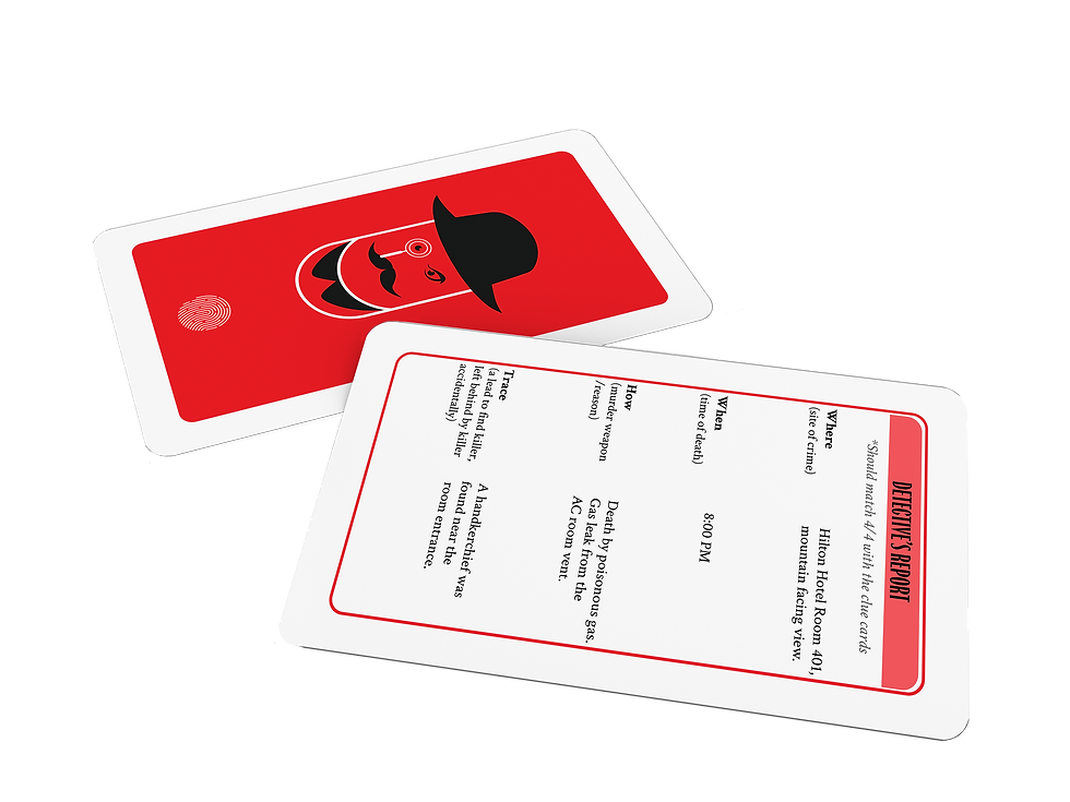 6. The fastest player to figure out the right suspect card and match them to the clue/evidence cards scores 4 points each card, i.e.,16 points.